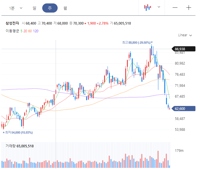 좌측이 삼성전자, 우측이 sk하이닉스입니다. 최근 고점을 갱신한 이후 반도체 업황이 안 좋을 것이라는 모건스탠의 리포트와 엔비디아 급락의 여파로 하락한 모습입니다. 반도체관련주들은 이들을 따라 움직이는 경향이 강하기 때문에 투자 시 주의해야 합니다.